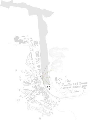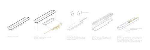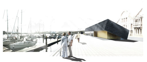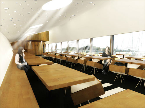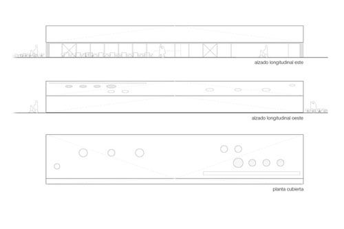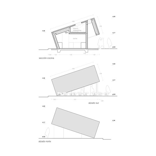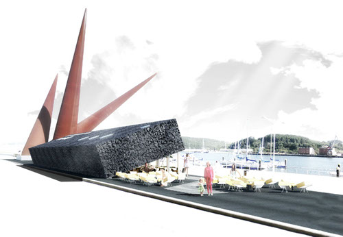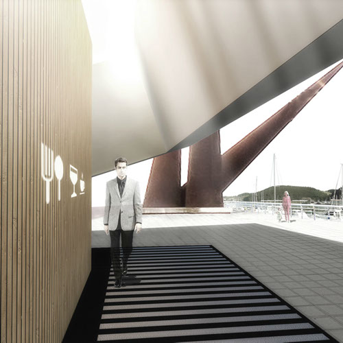 ...caracterizando una imagen de un "bote" secándose boca abajo e inclinado, sirviendo también de cobijo y apertura de vistas. De esta forma se parte de una morfología rectangular alargada que con un simple gesto de levantar el volumen desde la cara de la ría, se obtiene "vistas controladas de la ría", se produce una "menor presencia volumétrica" en la avenida del Conde de Guadalhorce, y se consigue una "imagen representativa" con una volumen contundente y sencillo que muestra su interior dando una mayor presencia del restaurante en el paseo y visible desde el resto de la ría.