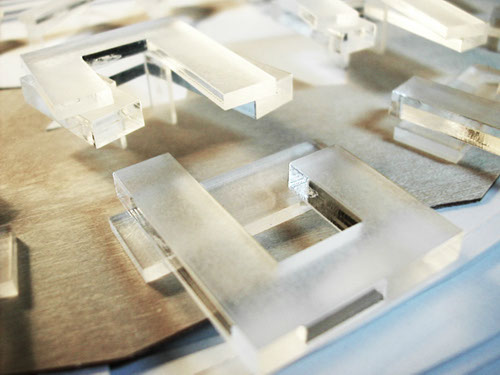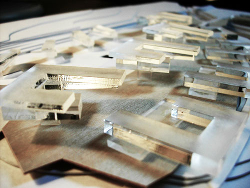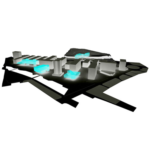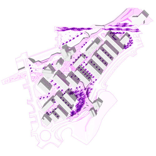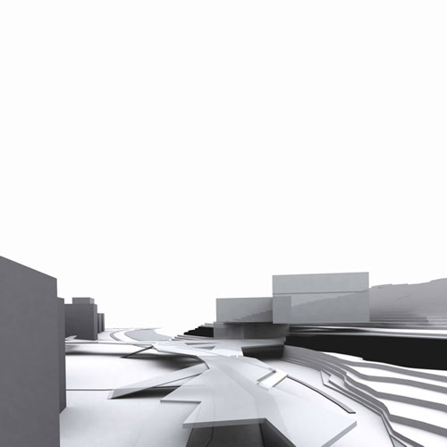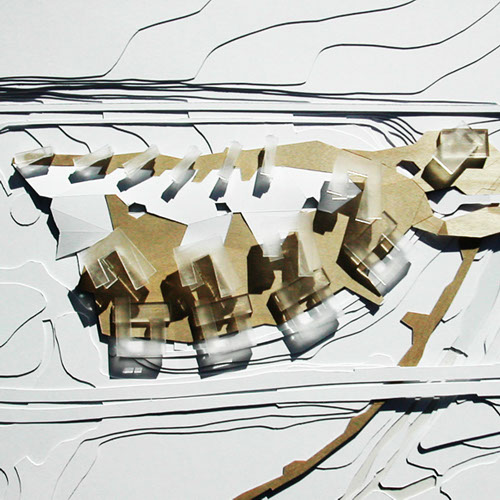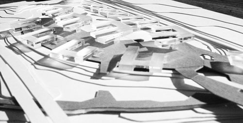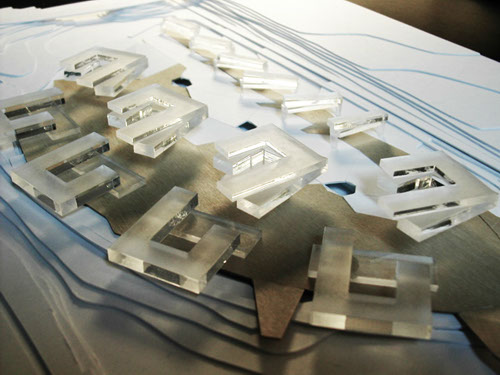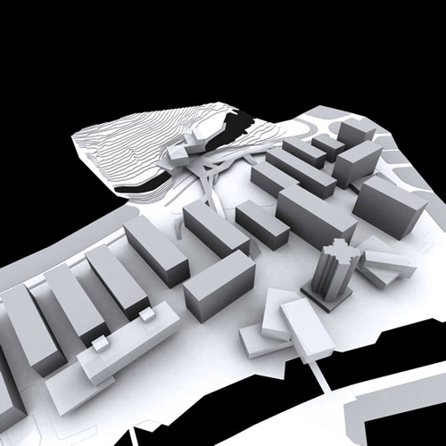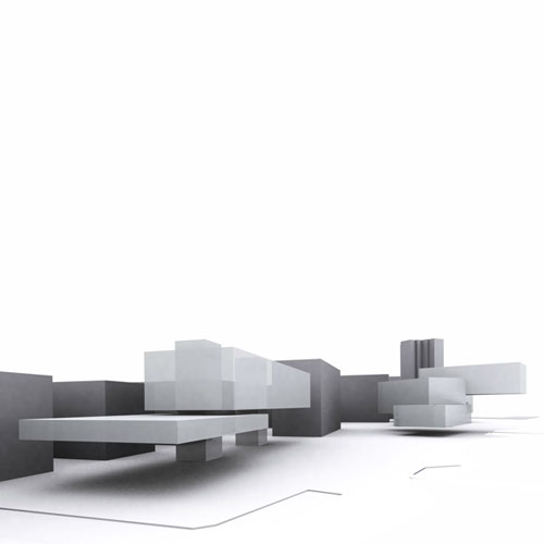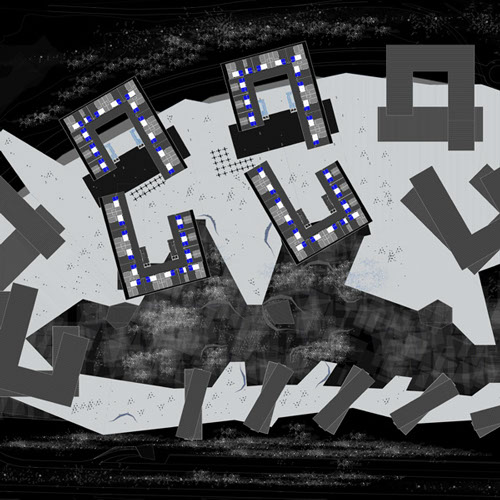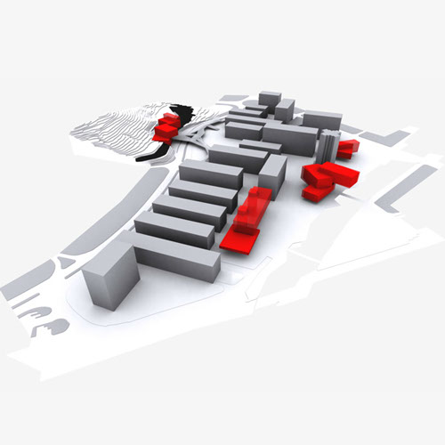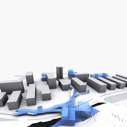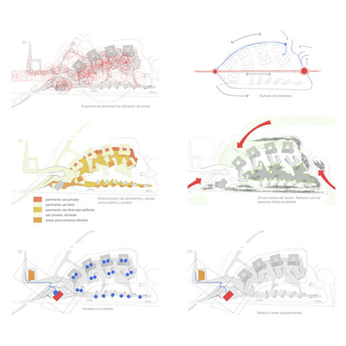 El área residencial se conforma con tres tipos edificatorios: 1_Viviendas colectivas de dos niveles y espacio comercial, 2_Viviendas colectivas elevadas dejando la planta baja libre, 3_ Viviendas aisladas elevadas. El conjunto de las volumetrias que parten de formas sencillas, se van adaptando a la topografía y a las tramas urbanas existentes produciendo giros entre plantas y volúmenes de 15 grados entre ellos, creando un espacio urbano dinámico y completamente articulado en sí.