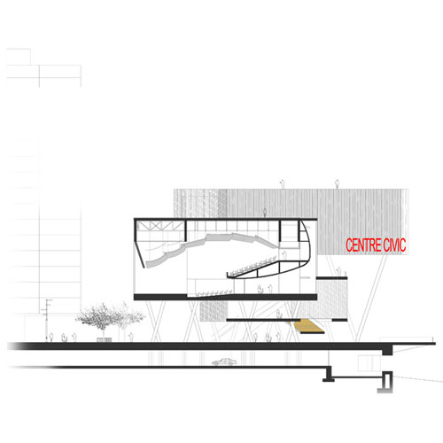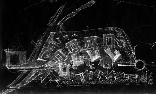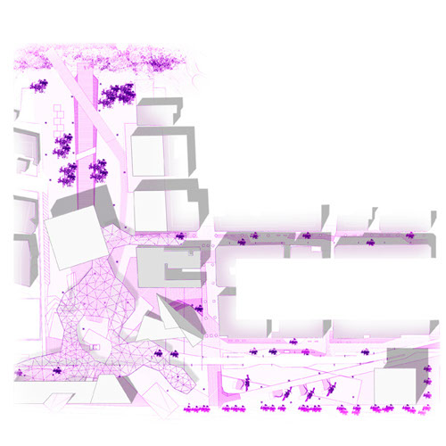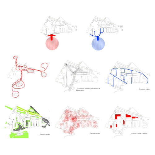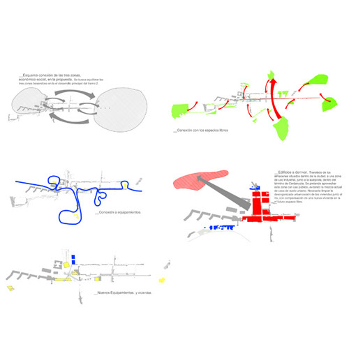 1_Centro Cívico 2_CAP 3_Mercado-Centro Comercial 4_Nuevo Colegio. Estos cuatro equipamientos se relacionan con los de la zona creando unas trayectorias en recorridos del lugar que conforman una intersección de direcciones en forma de _Y_ siendo esta la base del proyecto...