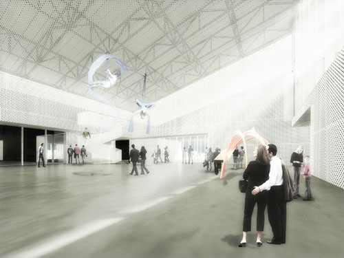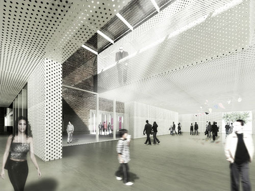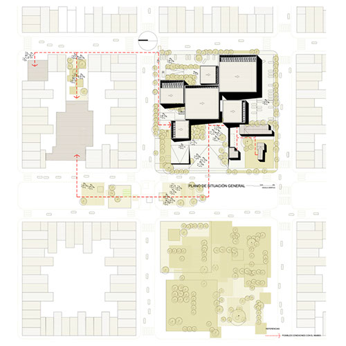 Hacia la avenida Olascoaga (cara oeste del terreno) se realiza el mayor vacío para evidenciar el acceso principal del CCLN. La plazoleta Mantelli y Velez Sarsfield oficia de conector entre el nuevo Centro Cultural y el actual complejo Cultura Casa de las Leyes, aconsejando incorporar además a todo este conjunto la manzana verde como foco urbano exterior. Con similares materiales y diseño se interviene en estas áreas. La relación con la serie de edificios existentes (EPAS) se realiza por los mismos espacios "vacíos", pudiendo a futuro incorporar estos edificios como parte del centro cultural.