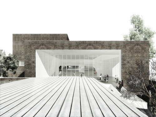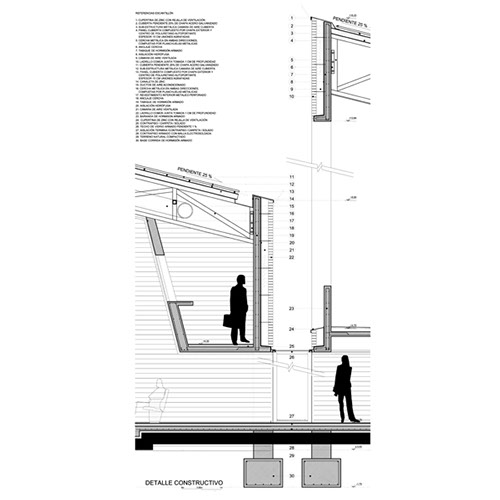 Un módulo cuadrado se repite variando sus dimensiones seis veces, Resto-Bar, Hall, Talleres, Teatro, Flexible y Multipropósito, albergando a todas las áreas cubiertas del edificio. En sección los módulos son definidos por una cubierta liviana de pendiente (25%) con orientación norte-sur, que posibilita el ingreso de luz natural y minimiza el área de sombra en el perímetro. La variación de la altura también permite ubicar entrepisos, azoteas técnicas, áreas de apoyo, etc..