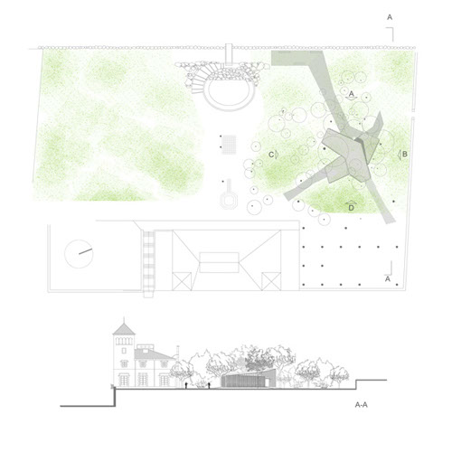 ...directriz clara de unir los diferentes entornos en los que se envuelve. Sucesivas alineaciones entre árboles importantes han configurado junto a las direcciones de los pasos la forma inicial de la planta.