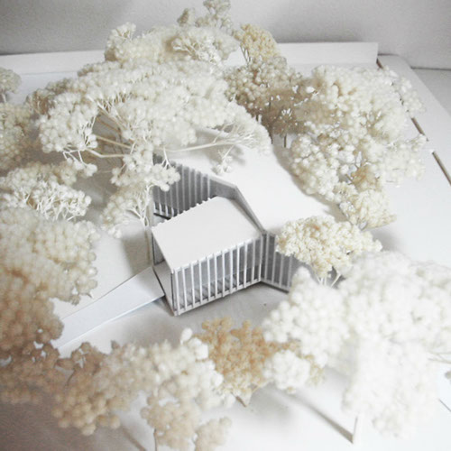 El edificio se alza por encima del suelo, y configura su forma final con la formación de dos piezas interseccionadas de forma ficticia, ya que una de ellas pasa por encima. Ambas siguen planos inclinados en sentido opuesto teniendo un mismo eje de giro en común, y rompiendo de esta forma regularidad estructural. Tanto en planta como en alzado, el edificio es irregular, pretendiendo integrarse en su entorno. Los caminos que se crean relacionan los espacios del jardín, y el edificio se relaciona con este por su forma y por la prolongación de partes de su cerramiento. Este está formado por montantes de aluminio blanco, que sirven de soporte para una hoja vidrio, que vería desde serigrafiado hasta trasparente, La estructura es de acero, formando pórticos irregulares con colocación de cruces de San Andrés. Pavimento de mortero con micropigmentación, de color gris marengo. El cerramiento pretende junto a las múltiples fachadas, dar movimiento el conjunto, viendo el edificio con texturas diferentes desde un cualquier punto de vista.