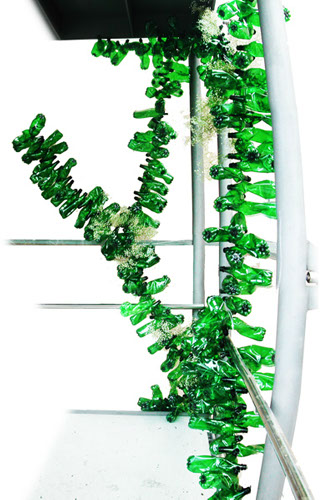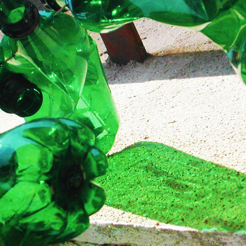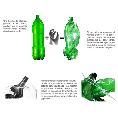 Una botella de plástico, gracias a su forma, produce en su aspecto exterior varias tonalidades de color verde. Si se deforma aumenta el número planos, y se consigue un mayor número de tonalidades de color verde. Se produce una mayor captación de luz y esta se propaga hacia la parte baja del patio. Alambre trenzado (elemento estructural de la enredadera), atraviesa las botellas por su parte alta. Para facilitar el paso del alambre trenzado, se coloca un pasa tubos del diámetro de el alambre. El elemento de sujeción es un empresillado para el diámetro específico.