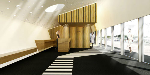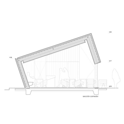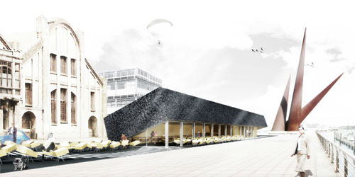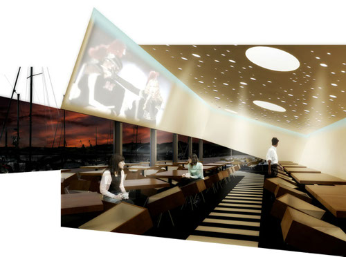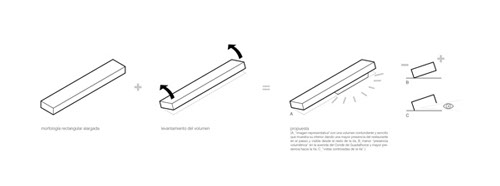 ...caracterizando una imagen de un "bote" secándose boca abajo e inclinado, sirviendo también de cobijo y apertura de vistas. De esta forma se parte de una morfología rectangular alargada que con un simple gesto de levantar el volumen desde la cara de la ría, se obtiene "vistas controladas de la ría", se produce una "menor presencia volumétrica" en la avenida del Conde de Guadalhorce, y se consigue una "imagen representativa" con una volumen contundente y sencillo que muestra su interior dando una mayor presencia del restaurante en el paseo y visible desde el resto de la ría.