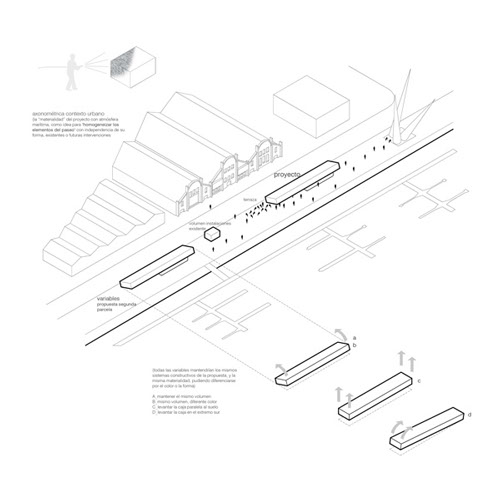 Este proyecto puede ser utilizable con pocas modificaciones en el solar sur. Como concepto de versatilidad se puede mantener la forma del proyecto de la parcela norte, dándole su propio carácter de dos formas diferentes: cambiando el "color" de acabado del volumen inclinado pero "manteniendo su materialidad", ó proponiendo el mismo volumen con diferentes posiciones de levantamiento de la caja utilizando el mismo sistema constructivo.