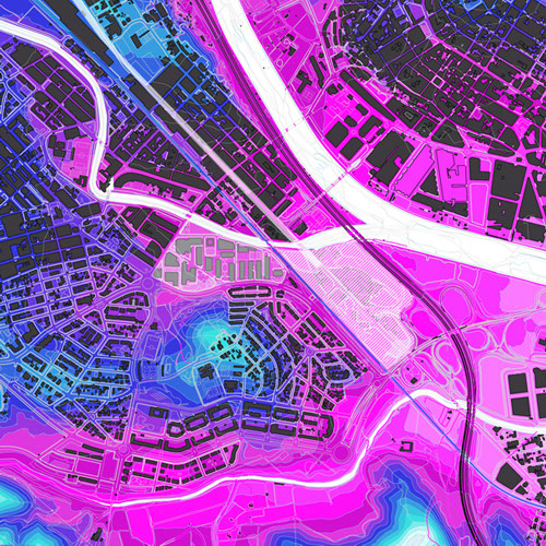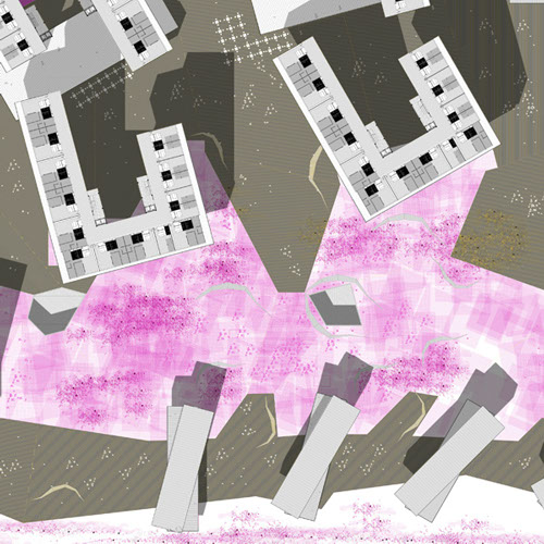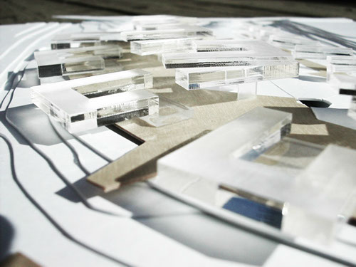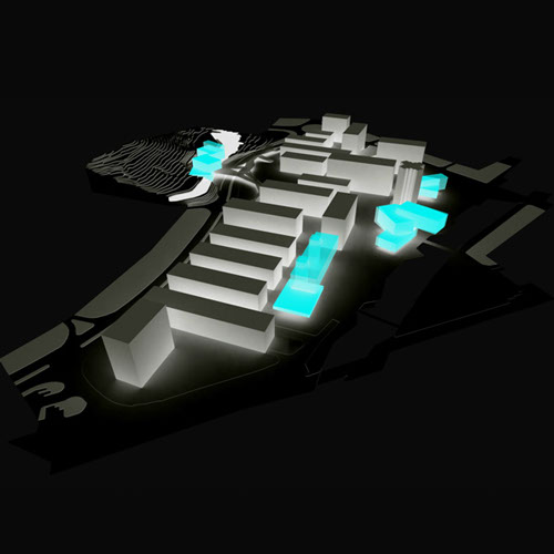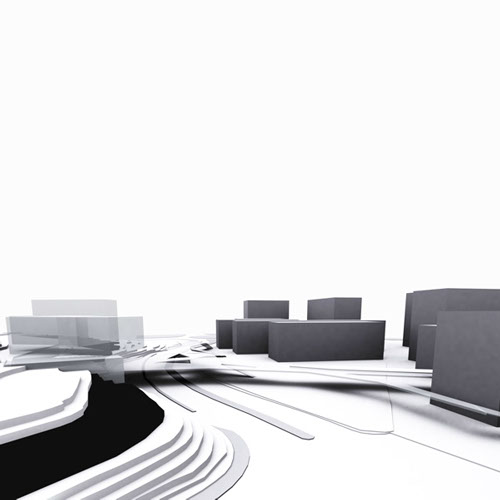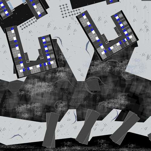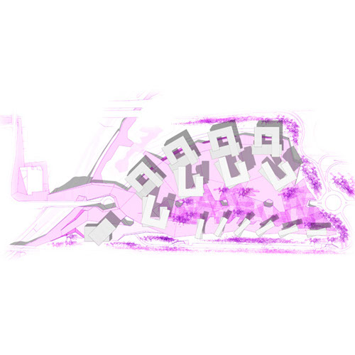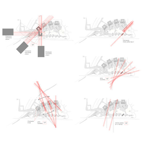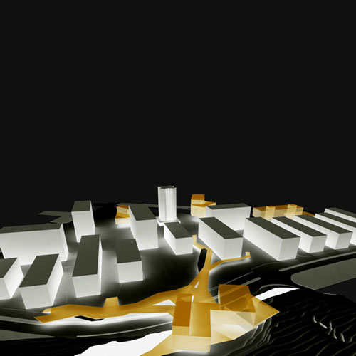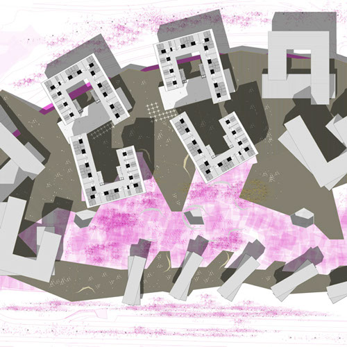 El área residencial se conforma con tres tipos edificatorios: 1_Viviendas colectivas de dos niveles y espacio comercial, 2_Viviendas colectivas elevadas dejando la planta baja libre, 3_ Viviendas aisladas elevadas. El conjunto de las volumetrias que parten de formas sencillas, se van adaptando a la topografía y a las tramas urbanas existentes produciendo giros entre plantas y volúmenes de 15 grados entre ellos, creando un espacio urbano dinámico y completamente articulado en sí.