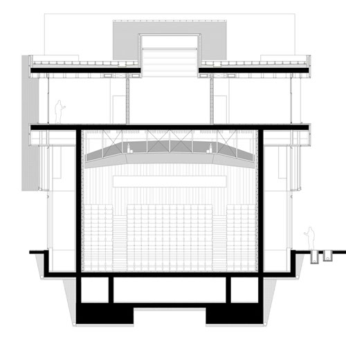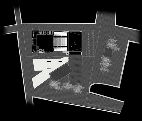 El programa queda conexo al entregarse y participar del espacio vacío que atraviesa al edificio en el volumen más opaco y lo abraza en el más permeable. La continuidad de éste hace imposible percibirlo en su conjunto y enriquece con visuales la constante percepción de la dinámica del centro de música. Este vacío interior se apoya en los dos accesos de la escuela, el principal cerca de la calle St. Pau y el secundario en el otro extremo, generando así dobles y triples espacios. La planta baja muestra al auditorio que situándose a doble altura frente al muro de vidrio, es visible en el perímetro rasante de la escuela.