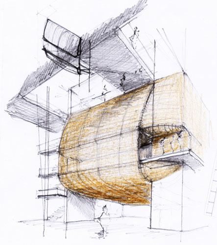 Antes que fuera concebido el proyecto, todas las cosas tenían el mismo aspecto, una masa confusa y sin forma, un peso muerto en el cual, sin embargo, estaban las semillas de las cosas. Como el Raval y la escuela de música estaban mezclados, el edificio no estaba definido, ni el barrio completado. Se puso fin al desorden, separando los espacios servidos de los servidores y al Raval de ambos dos. Luego, se dispuso mejor lo servido y distribuyó las partes del programa, definiendo el auditorio como elemento sustentador de la escuela. El entorno se esclareció y la actividad fue apareciendo. Los curiosos tomaron posesión del espacio dinámico de la escuela, los ciudadanos de su espacio libre y los músicos se apropiaron de las aulas.