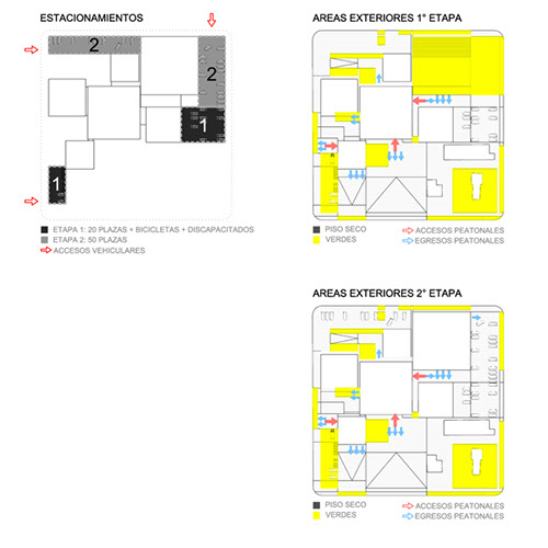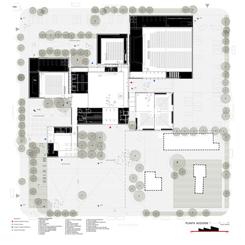 Hacia la avenida Olascoaga (cara oeste del terreno) se realiza el mayor vacío para evidenciar el acceso principal del CCLN. La plazoleta Mantelli y Velez Sarsfield oficia de conector entre el nuevo Centro Cultural y el actual complejo Cultura Casa de las Leyes, aconsejando incorporar además a todo este conjunto la manzana verde como foco urbano exterior. Con similares materiales y diseño se interviene en estas áreas. La relación con la serie de edificios existentes (EPAS) se realiza por los mismos espacios "vacíos", pudiendo a futuro incorporar estos edificios como parte del centro cultural.
