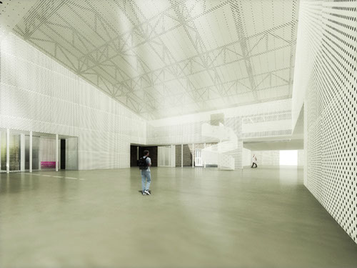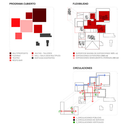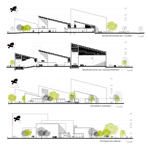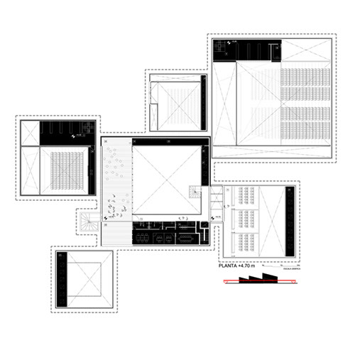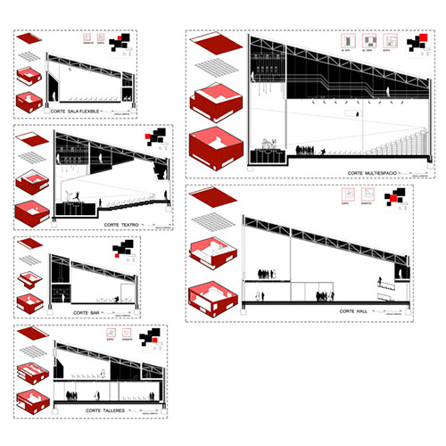 Un módulo cuadrado se repite variando sus dimensiones seis veces, Resto-Bar, Hall, Talleres, Teatro, Flexible y Multipropósito, albergando a todas las áreas cubiertas del edificio. En sección los módulos son definidos por una cubierta liviana de pendiente (25%) con orientación norte-sur, que posibilita el ingreso de luz natural y minimiza el área de sombra en el perímetro. La variación de la altura también permite ubicar entrepisos, azoteas técnicas, áreas de apoyo, etc..
