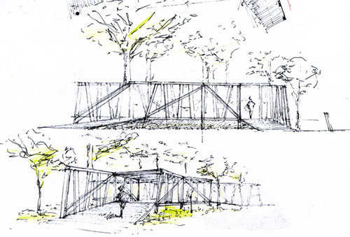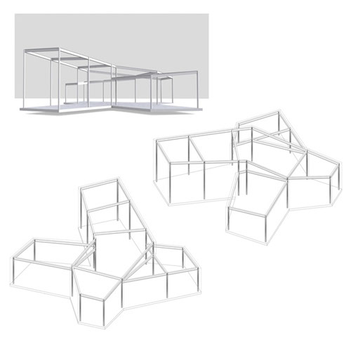 La forma parte de relacionar cinco direcciones aunque solo posee cuatro cuerpos que continúan con cuatro de las cinco: tres direcciones poseen su propio brazo en el pabellón, otro sigue una dirección visual hacia estanque existente, y la última relaciona un espacio no aprovechado, como es la zona del puente pasarela.
