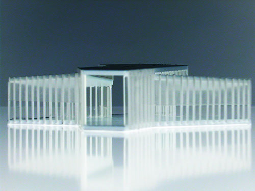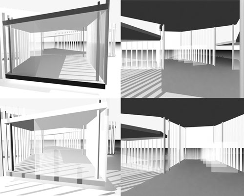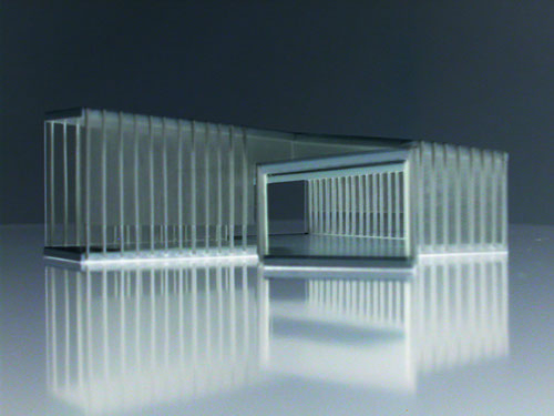 El edificio se alza por encima del suelo, y configura su forma final con la formación de dos piezas interseccionadas de forma ficticia, ya que una de ellas pasa por encima. Ambas siguen planos inclinados en sentido opuesto teniendo un mismo eje de giro en común, y rompiendo de esta forma regularidad estructural. Tanto en planta como en alzado, el edificio es irregular, pretendiendo integrarse en su entorno. Los caminos que se crean relacionan los espacios del jardín, y el edificio se relaciona con este por su forma y por la prolongación de partes de su cerramiento. Este está formado por montantes de aluminio blanco, que sirven de soporte para una hoja vidrio, que vería desde serigrafiado hasta trasparente, La estructura es de acero, formando pórticos irregulares con colocación de cruces de San Andrés. Pavimento de mortero con micropigmentación, de color gris marengo. El cerramiento pretende junto a las múltiples fachadas, dar movimiento el conjunto, viendo el edificio con texturas diferentes desde un cualquier punto de vista.