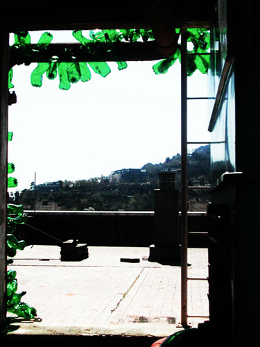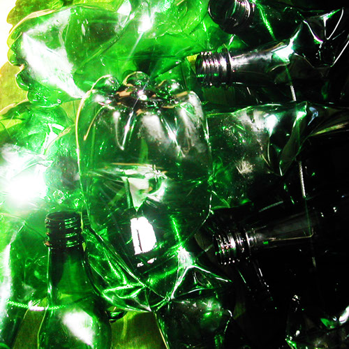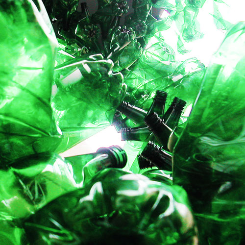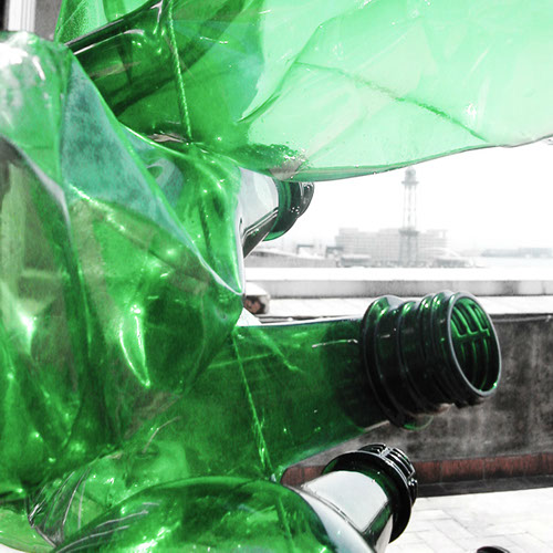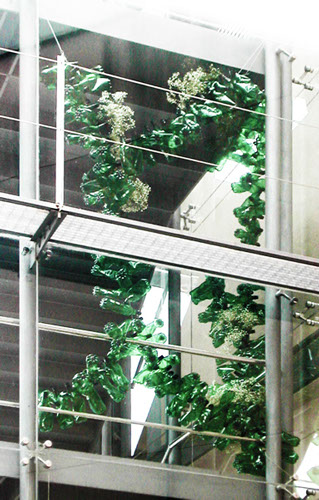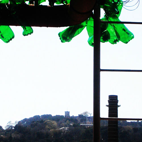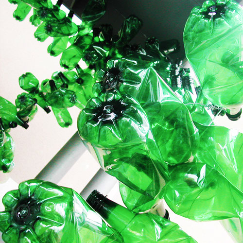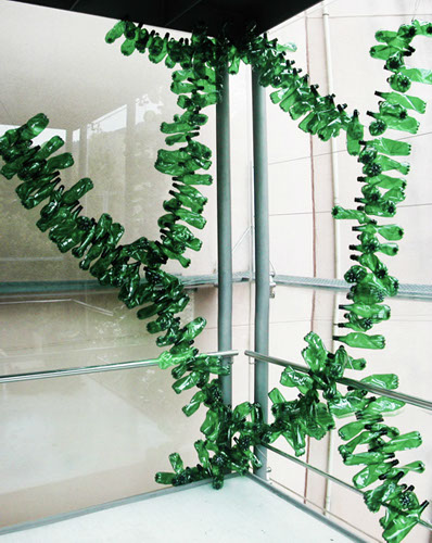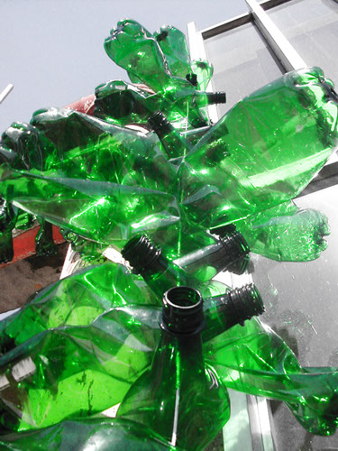 Una botella de plástico, gracias a su forma, produce en su aspecto exterior varias tonalidades de color verde. Si se deforma aumenta el número planos, y se consigue un mayor número de tonalidades de color verde. Se produce una mayor captación de luz y esta se propaga hacia la parte baja del patio. Alambre trenzado (elemento estructural de la enredadera), atraviesa las botellas por su parte alta. Para facilitar el paso del alambre trenzado, se coloca un pasa tubos del diámetro de el alambre. El elemento de sujeción es un empresillado para el diámetro específico.
