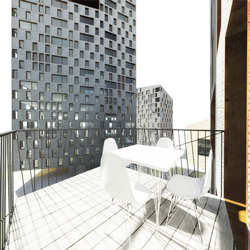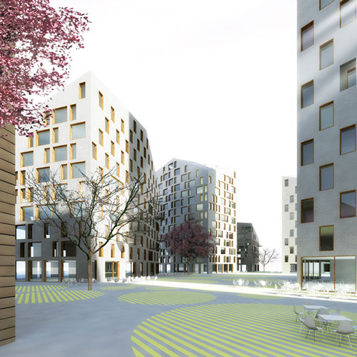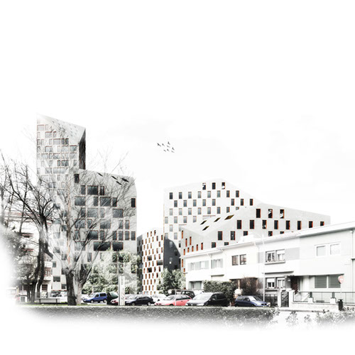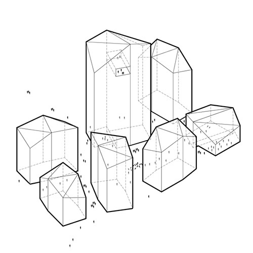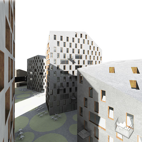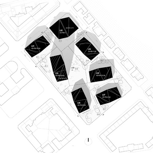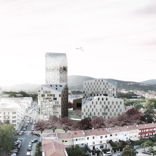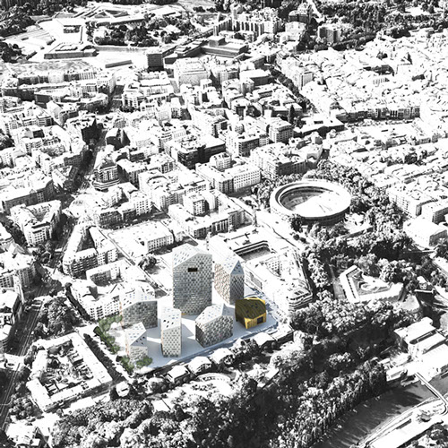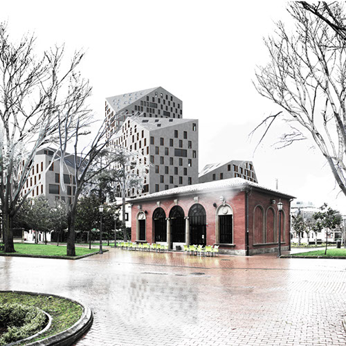 3_Crear “nuevo centro” de la ciudad, con una disposición volumétrica que genere espacios públicos irregulares y atractivos con comercios como en el Casco Viejo, menor ocupación en planta en concepción a la trama de volúmenes disgregados de viviendas unifamiliares que permite nuevas visuales y permeabilidad urbana, y la densidad volumétrica del ensanche.