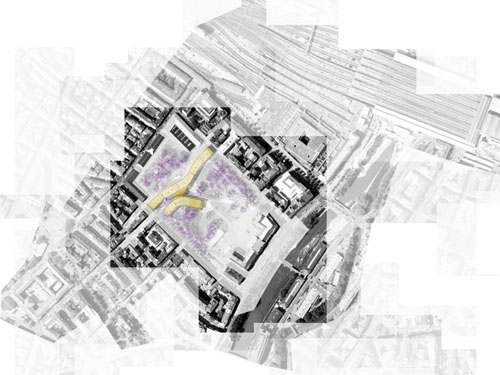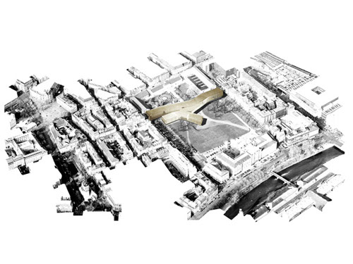 La dirección de las piezas existentes del solar esta marcada desde la orilla opuesta del rio Shil, siendo todas las piezas paralelas a excepción de Zeughausareal que toma la dirección de Rotwandstrasse. Existe un eje de conexión virtual que conecta estas piezas siendo eje de simetria de los edificios de la parte sur (Alte Kaserne), los edificios de la orilla opuesta y la pasarela sobre el rio, y marca uno de los accesos de la parte norte del solar en su lado izquierdo.