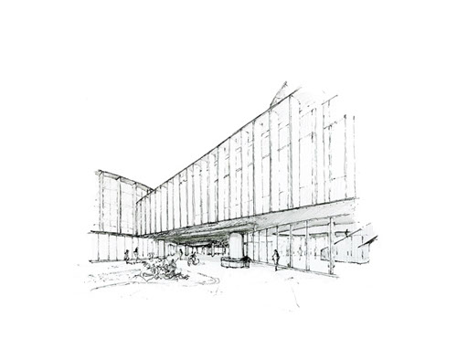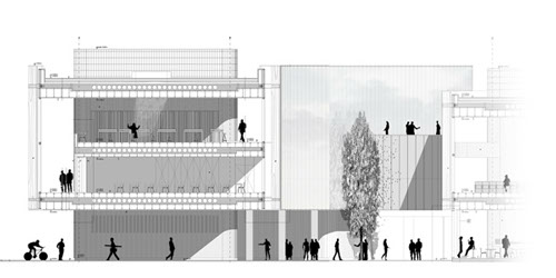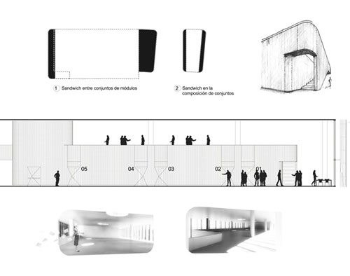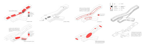 La propuesta de proyecto, en base a la propuesta urbanística y el programa del edificio, parte de la necesidad de crear relaciones diferentes en varios niveles con el entorno. “La idea es crear una envolvente mediante una trazada continua o Cinta, como elemento de orden entre el volumen del edificio y las diferentes necesidades urbanísticas con el entorno” . Se desarrolla tres niveles sobre rasante: planta baja (zócalo), planta 1 y planta 2 (ritmo), que respetan la altura de los edificios del espacio norte.