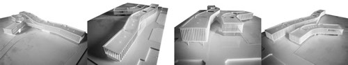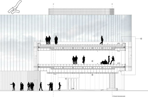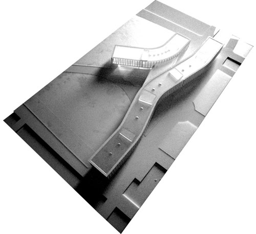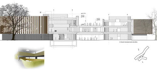 Bajo el elemento puente se producen los dos accesos al edifico, (aulario, y auditorio y bar-restaurante, pudiendo funcionar este paquete de programa de forma independiente).