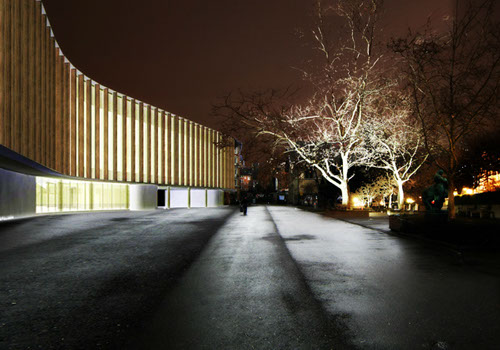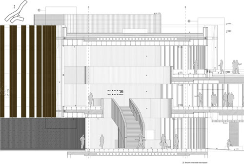 Los diferentes partes del programa se agrupan en paquetes para crear espacios burbuja o de respiración debido a la gran longitud del edificio dando profundidad a la composición de fachada. Esta fachada interior es de listones de madera con tonalidades de color diferentes en cada paquete para crear referencia espacial dentro del edificio. Esta agrupación en paquetes permite simplificar la organización de las instalaciones del edifico, existiendo en cada paquete un núcleo de instalaciones vertical junto a una escalera de incendios que sirve también como referencia espacial y distribuyen las instalaciones del edificio por falsos techos y suelos técnicos. Los paquetes están formados por un sistema de piezas que se repiten y combinan en función de la necesidad del paquete. Las esquinas del edificio están achaflanadas con diferentes radios de giro para dar fluidez a la circulación y para difuminar las esquinas en composición de telón de fondo de la fachada.