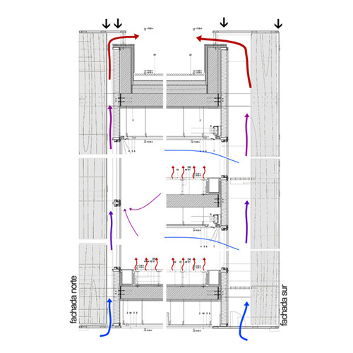Las lamas de madera microlaminada tienen tres funciones: ‘constructiva’ sujeción de la capa exterior de vidrio que sufre las acciones externas dando rigidez al cerramiento, ‘estética’ dando una imagen conjunta y elegante al edificio, y ‘funcional’ como respuesta a la acción solar sobretodo en épocas estivales.