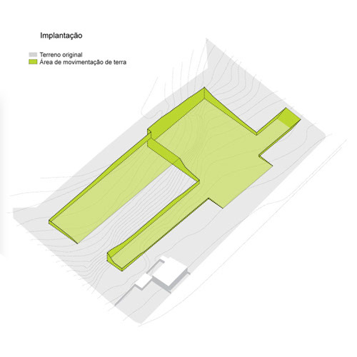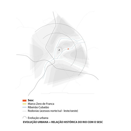 La ciudad: una ocupación dispersa, de reciente pasado rural, de baja densidad y mayoritariamente residenciales en las cotas altas; e industriales y de servicios a lo largo de la avenida principal y la corriente. El paisaje natural: un terreno accidentado y con fuerte pendiente natural, acentuado por la transformación de tierras del equipamiento deportivo existente en las inmediaciones (el estadio "Lanchão"). La lectura final del área es un paisaje compuesto de pequeños fragmentos en las colinas y grandes bloques de servicios a lo largo de la avenida principal. El nuevo SESC debe ser un elemento organizador - un MARCO URBANO - implicado en el tejido urbano existente, además de un nuevo equipamiento que dialogue y renueve la IDENTIDAD a lo largo del paseo del río y las calles secundarias cercanas al terreno, creando un espacio fértil para la cultura y las artes.