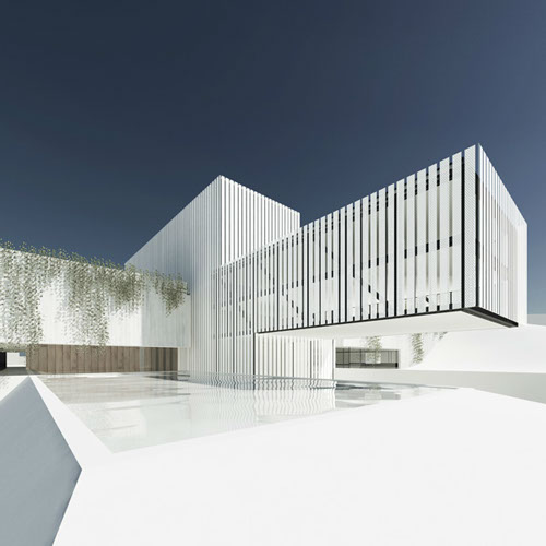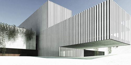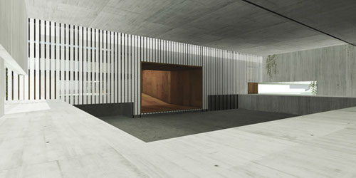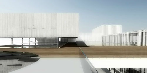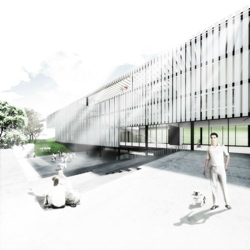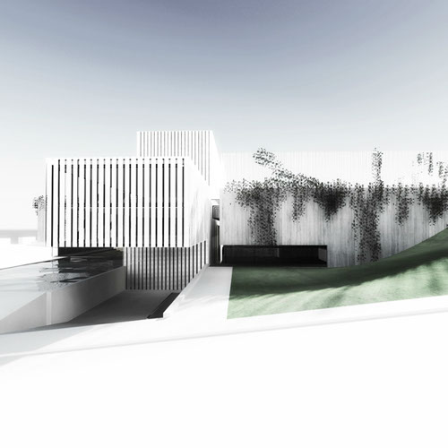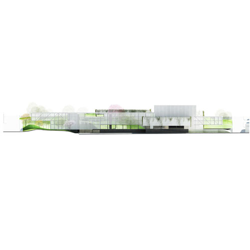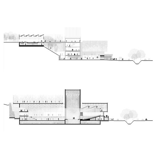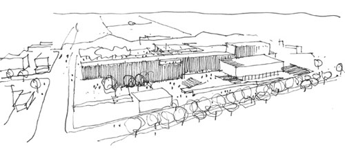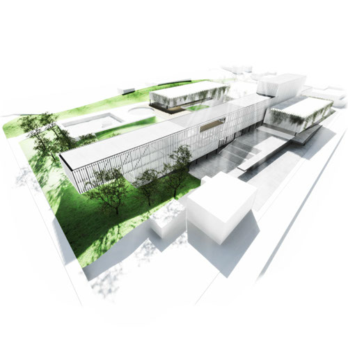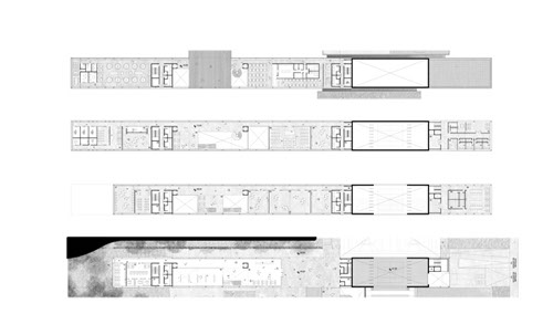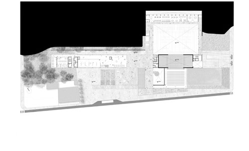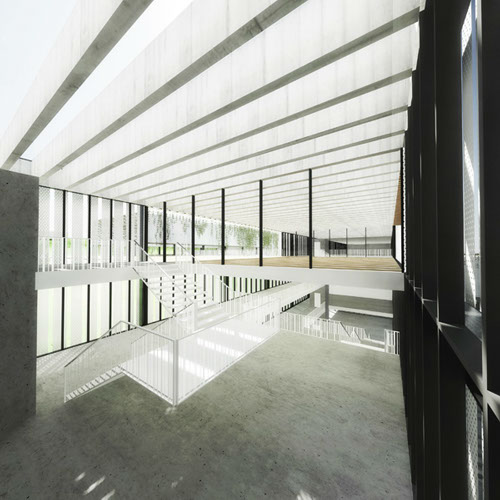 El reto fue distribuir un programa de grandes áreas planas en un terreno inclinado. Por lo tanto, la organización de las áreas se hace a través de la Gran plaza abierta que da acceso a la barra de actividades, por donde seguimos hacia los grandes volúmenes opacos y la plataforma elevada para actividades al aire libre.