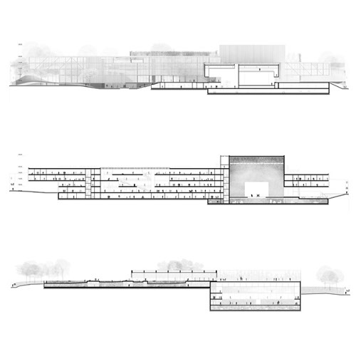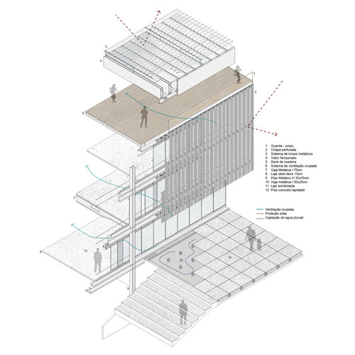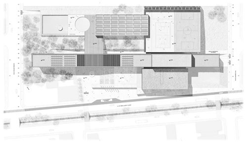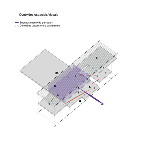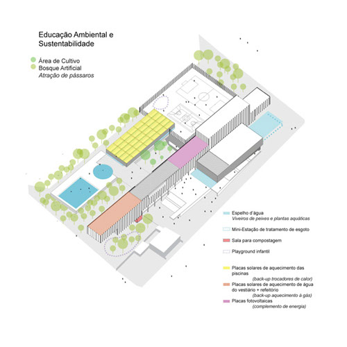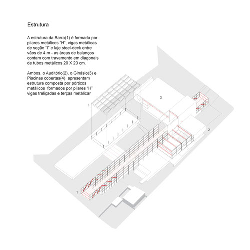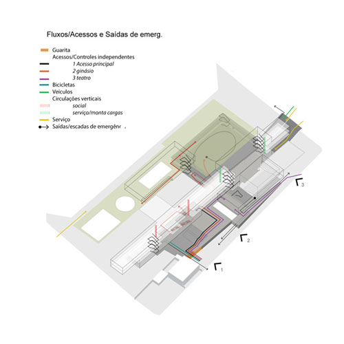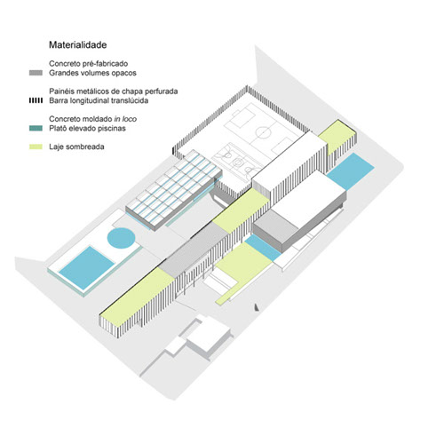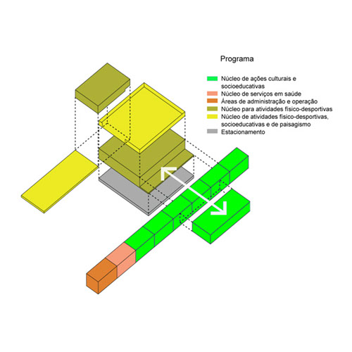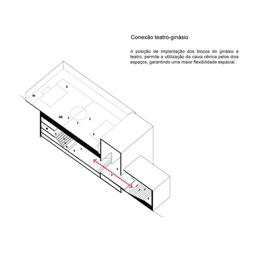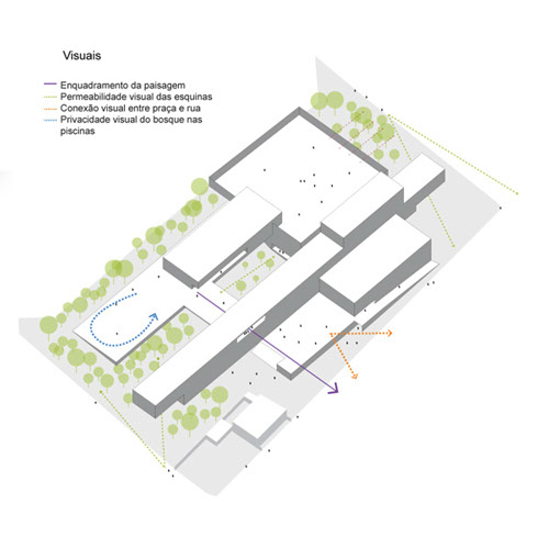 La disgregación adoptada, por tanto, le da LEGIBILIDAD al interior en la parte central y cerca del entorno urbano a través de HORIZONTALIDAD (Barra de actividades) siendo un marco horizontal que se adapta a la topografía, como contrapunto al fragmento de las casas del entorno. Para lograr estos objetivos, se optó por aproximar las áreas visualmente más permeables (translúcidas) a las cotas bajas del terreno. El proyecto crea OJOS (visibilidad: identificación elementos del entorno) hacia la calle en las cotas bajas a través de trasparencias y vacíos, al mismo tiempo que refuerza el carácter deportivo de las cotas altas (áreas descubiertas) propiciando vistas y coberturas espaciales reveladoras tanto interna como externamente al equipamiento. Por otro lado, los grandes equipamientos opacos - como el Gimnasio y la Caja Escénica del Cine-Teatro se encuentra cerca de la Rua Rio Grande do Sul, con el fin de minimizar el movimiento de tierras necesaria para su implantación, relegando las zonas de carga y descarga, y accesos de servicios.